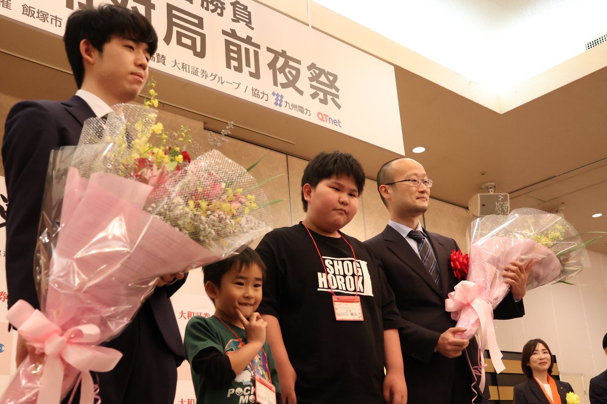 名人戦第4局の前夜祭、渡辺明名人と藤井聡太竜王への花束贈呈で檀上に上がった少年が「将棋放浪記」のTシャツを着ていて、目が釘付けに。 https://t.co/tFliXUFWwP