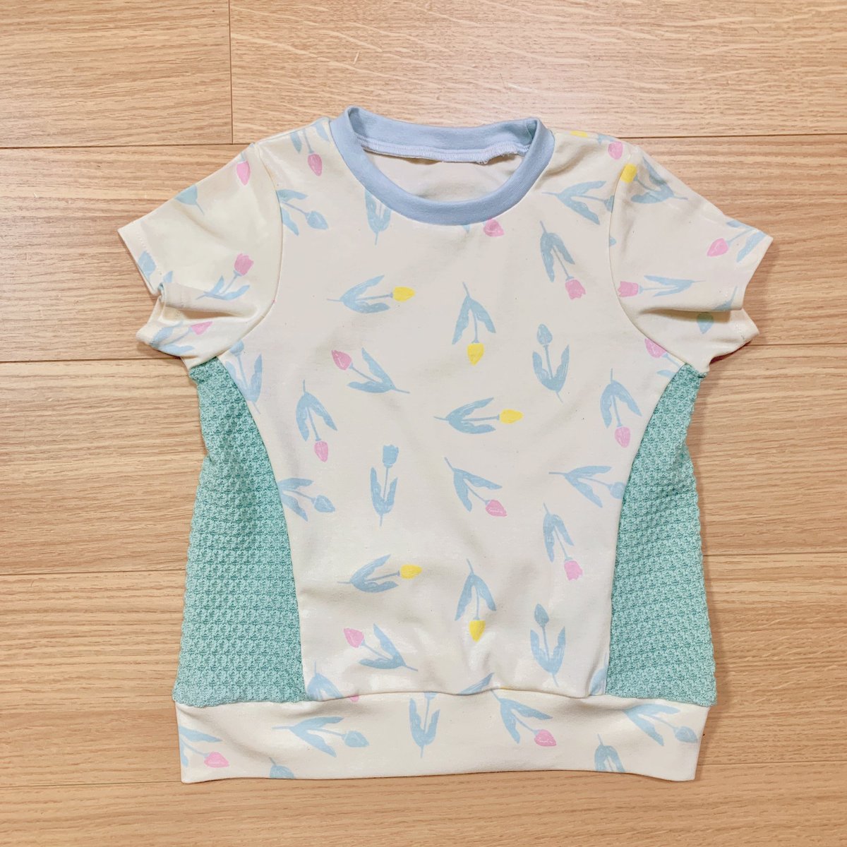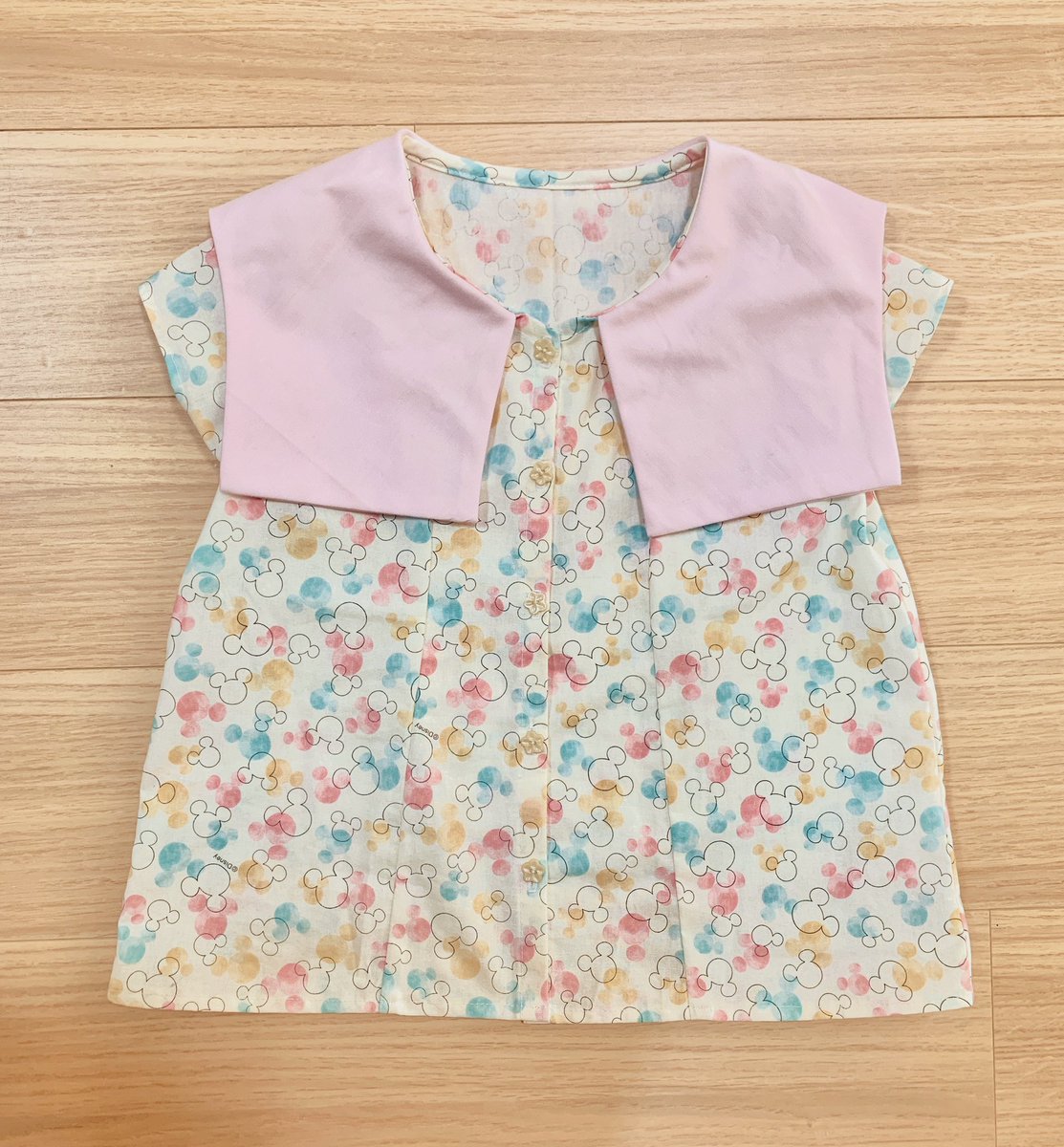 例のあの場所のために作った半袖ブラウス。バチバチのキャラ生地が多い中、この生地を見て一目惚れ。時間と余裕があれば襟に娘の好きなキャラ刺繍したかった😭 https://t.co/p635OXO582