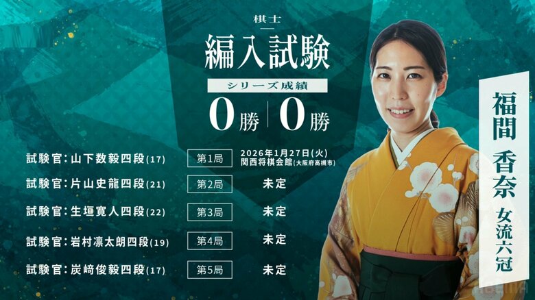 福間香奈女流六冠、2度目の棋士編入試験第2局は2月16日に実施 次なる試験官は片山史龍四段